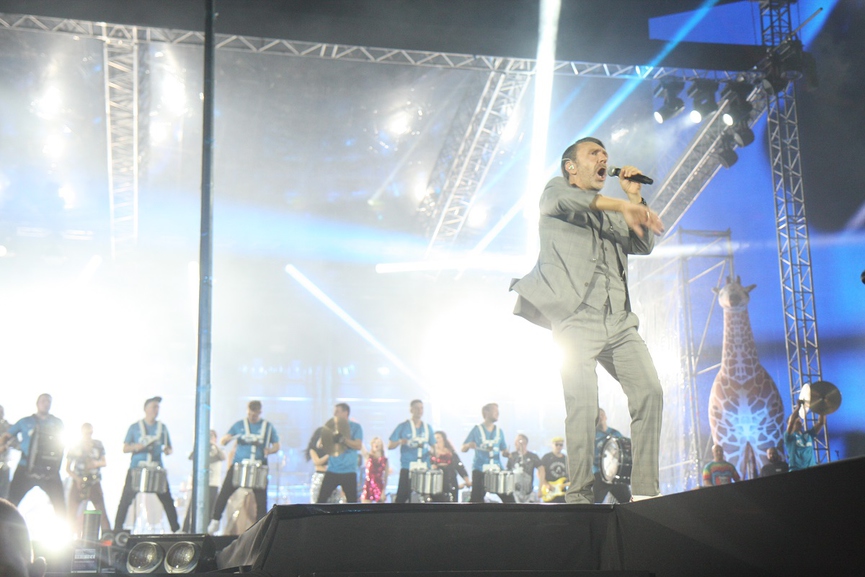 Описать в полной мере действо на арене невозможно – там была и автобусная остановка с барабанной установкой, и четырёхметровый игрушечный жираф, и декорации панельной пятиэтажки, из которой появлялись люди. А на экране демонстрировались забавные арт-объекты и видеоинсталляции. Сам Сергей облачился в серый приталенный костюм, который как бы намекал всем – я вырос из «пацана на районе» и стал уважаемым человеком, а чего добился ты?