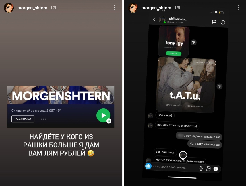 Вчера Morgenshtern весь день радовался успеху своего нового сингла «Show» и 10 миллионам подписчиков на YouTube-канале. Также он решил проверить, сколько пользователей Spotify слушали его треки в течение месяца. Узнав, что их почти 2,7 миллиона, рэпер погорячился и заявил в stories, что наградит миллионом рублей того, кто покажет ему более востребованного российского артиста. Очевидно, Алишер полагал, что правда является чемпионом стримингов страны. Но один из его фолловеров нашёл настоящих лидеров: у ростовского электронщика Tony Igy, автора вирусного EDM-трека «Astronomia» из мема с танцующими носильщиками гробов, набралось 4 435 496 слушателей в Spotify за месяц, а у давно распавшейся группы t.A.T.u. — 3 130 465.