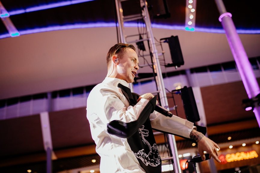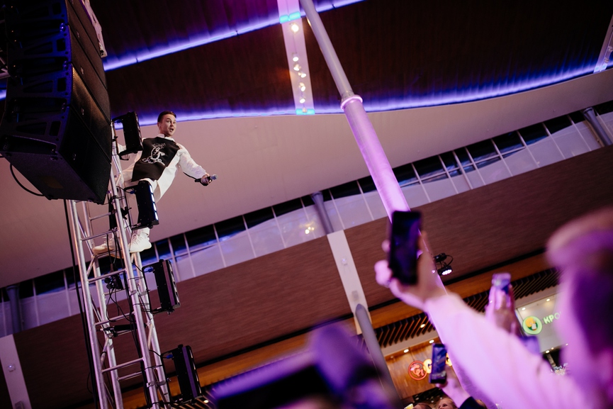 Закрывал вечеринку харизматичный Артём Пивоваров, который был заряжен энергией настолько, что не смог устоять на сцене: в какой-то момент артист внезапно вскарабкался на одну из технических конструкций и с лёгкостью продолжил петь с высоты, произведя сильное впечатление на фанатов.