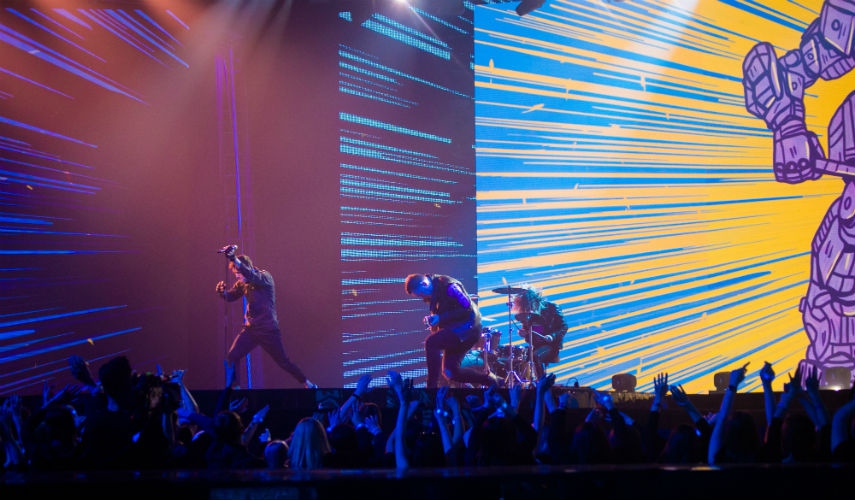 Баста раскованно общается с залом, цепляет из него парня по фамилии Дулин, которого в ожидании мотора будет упоминать в своих шутках. Парень с микрофоном контрольно просит всех выключить мобильные телефоны и напоминает о запрете съёмки Stories и объявляет начало концерта. Включаются анимированные экраны с логотипом шоу «ПЕСНИ», Павел Воля выходит на середину сцены и приглашает всех финалистов двух сезонов телепроекта. Оглядев наряды артистов, кто-то сзади сравнивает их с супергероями Marvel, и тут же из колонок раздаётся гимн в исполнении участников. В итоге, радоваться и вопить под открывающий номер всем посчастливилось пять раз подряд. Какой из дублей попал в эфир ― оценить сложно при всей пестроте происходящего на сцене «ГЛАВКИНО».
