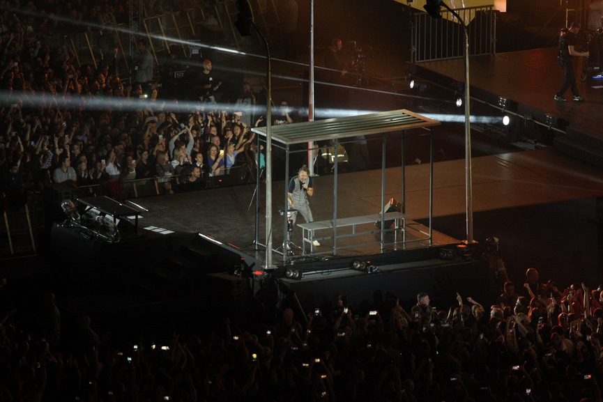 Описать в полной мере действо на арене невозможно – там была и автобусная остановка с барабанной установкой, и четырёхметровый игрушечный жираф, и декорации панельной пятиэтажки, из которой появлялись люди. А на экране демонстрировались забавные арт-объекты и видеоинсталляции. Сам Сергей облачился в серый приталенный костюм, который как бы намекал всем – я вырос из «пацана на районе» и стал уважаемым человеком, а чего добился ты?